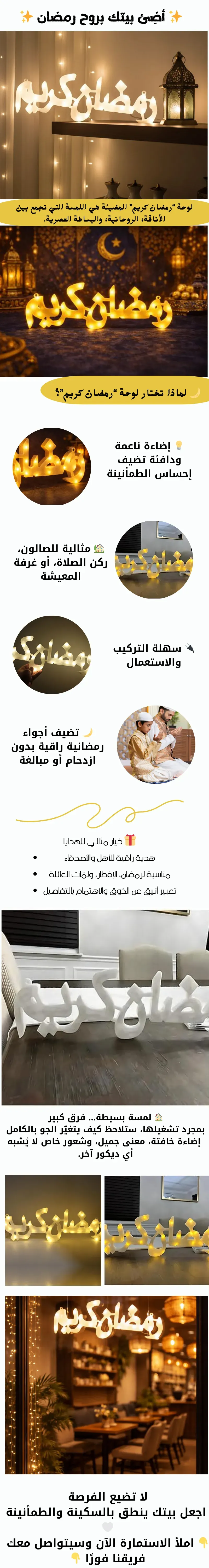 حوّل أي ركن في منزلك إلى مساحة دافئة تنبض بأجواء الشهر الفضيل 🌙 لوحة “رمضان كريم” المضيئة هي اللمسة التي تجمع بين الأناقة، الروحانية، والبساطة العصرية.