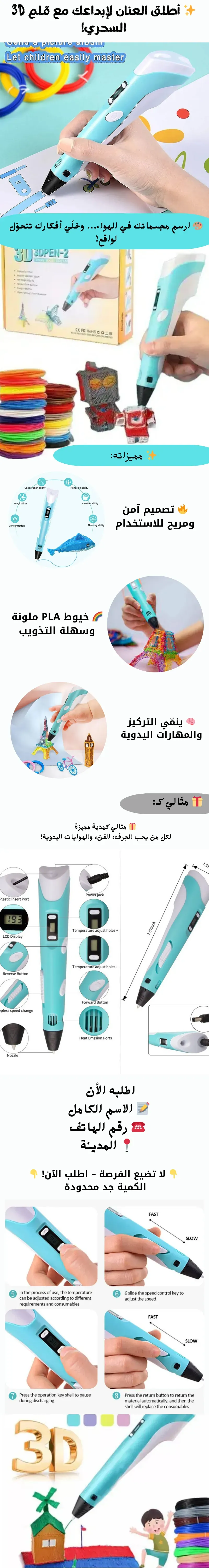 قلم 3D سهل وآمن 🎨 يخليك ترسم مجسمات حقيقية في الهوا! مثالي للأطفال والكبار لتنمية الإبداع ✨